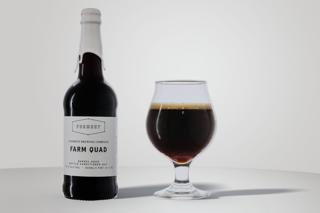 Ferment Farm Quad is a rich and layered quadruple that starts with a grain bill of five of the most iconic malts of Europe and an addition of dark candi beet sugar syrup from Belgium into the kettle. Following a modest charge of European hops, the brewery ferments out the brew with its White River farmhouse strain along with a Belgian monastic strain and Champagne yeast. Months spent in French oak wine barrels with Brettanomyces results in a deep copper ale loaded with rich, fruity esters, cocoa, coffee, dried fruit, and a snap of barnyard Brett (10.7% ABV).
