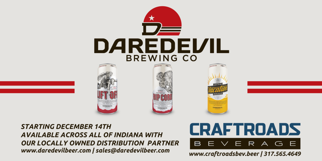 Daredevil Brewing Co is excited to announce we are transitioning our Indiana distribution to Craftroads Beverage, a locally owned and operated distributor effective December 14, 2020. The Craftroads team will immediately be supplying Lift Off IPA, Rip Cord DIPA, Vacation Kolsch and the entire Daredevil portfolio across all 92 counties of the state of Indiana.