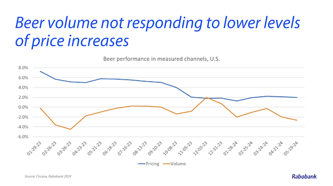 While beer companies could lower prices, recent history suggests that consumers are unlikely to significantly change their spending habits, according to Watson. For example, beer pricing fell below +2% in Circana-tracked channels at the end of January 2024 – after spending most of 2023 above +4% – but beer volume also declined to -2%, its lowest volume growth level since early 2023.