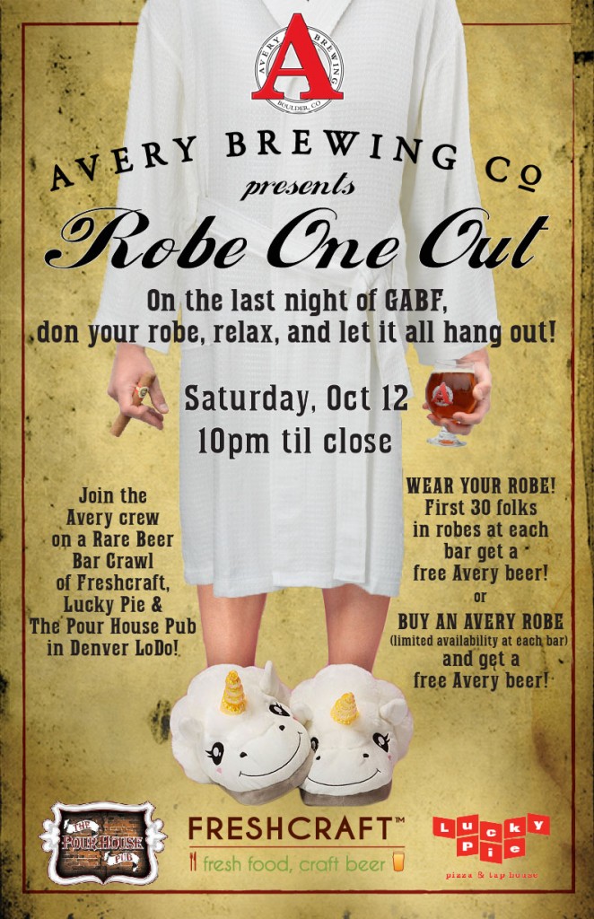 The Robe One Out party starts at 10pm on Saturday Oct. 12th at all three locations- Freshcraft, Lucky Pie LoDo and The Pour House Pub. A limited supply of Avery embroidered robes will be available for purchase at all three bars. Purchase an Avery robe and you get a free beer. Or wear your own robe and be one of the first 30 through the door and you also get a free Avery beer. Rare Avery beers and Tap Room exclusives will be on tap at all three locations.