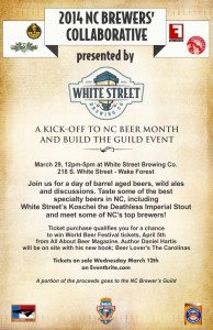 Wake Forest, NC – White Street Brewing Company is thrilled to host a kick off to NC Beer Month and Build the Guild event, with guest speakers from Fullsteam, Foothills Brewing, Mother Earth Brewing, and Wicked Weed Brewing. Featuring barrel aged and wild ales including White Street’s first cork and cage bottle, Koschei the Deathless Imperial Stout. Two discussion panels mediated by Margo Knight-Metzger will focus on “Barrel Aging Beers” and “What’s New in Brewing 2014,” followed by a meet and greet with some of the best brewers in NC. Daniel Hartis, author of “Beer Lover’s The Carolinas” will be onsite with copies of his new book, officially set to release April 15. A portion of proceeds from sales will go to the NC Brewers Guild. Tickets are $10 and include a special souvenir glass and an entry to win World Beerfest tickets April 5, 2014 from All About Beer Magazine. Tickets go on sale March 7, 2014 on Eventbrite and seating is limited.