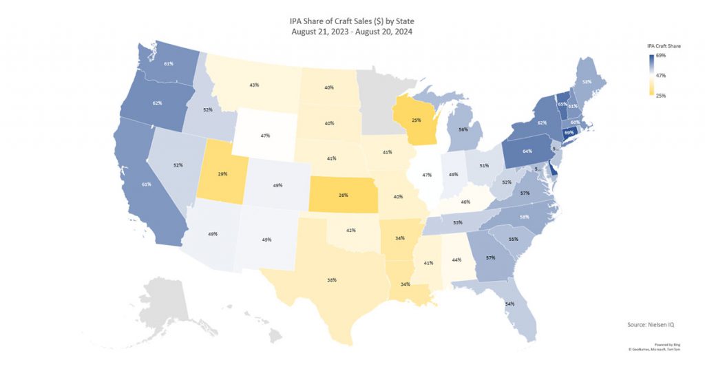 The geographically tiny East Coast states both boast a 69% share of craft dollars spent on IPA in the 52-week period ending August 20, according to NIQ data cited by Gacioch.
