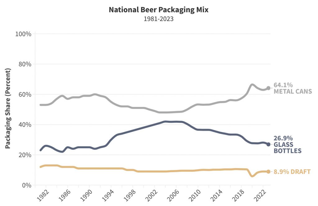 The BI began tracking beer package share in 1981, when cans accounted for 53% of volume, followed by bottles (23%), draft (12%) and refill bottles (12%), which have since disappeared from the landscape.