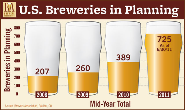 The U.S. now boasts 1,790 breweries—an increase of 165 additional breweries since June 2010. The Brewers Association also tracks breweries in planning as an indicator of potential new entrants into the craft category, and lists 725 breweries in planning today compared to 389 a year ago. Additionally, the count of craft brewers was at 1,740 as of June 30, 2011.