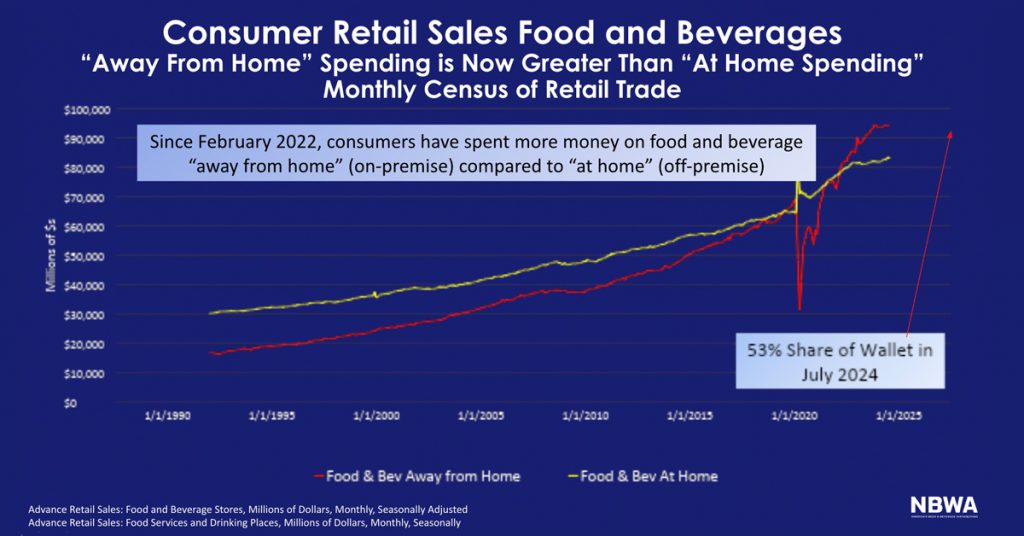 Consumer spending on food and beverages away from home continues to account for the majority of food and beverage costs, National Beer Wholesalers Association (NBWA) chief economist and VP of analytics Lester Jones said during the trade organization’s Annual Convention last week in San Diego.