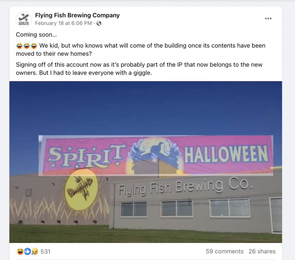 Flying Fish’s Facebook account posted an image of a Spirit Halloween banner over the brewery location on February 18 with the caption: “Coming soon … we kid but who knows what will come of the building once its contents have been moved to their new homes? Signing off of this account now as it’s probably part of the IP that now belongs to the new owners. But I had to leave everyone with a giggle.”