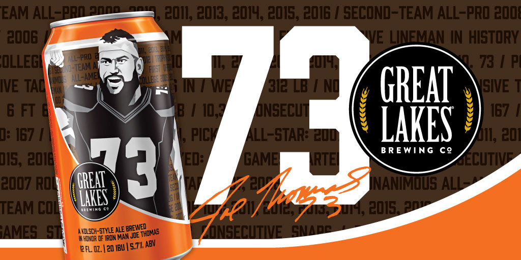 CLEVELAND — Great Lakes Brewing Co. (GLBC) announces the creation of 73, a limited edition Kolsch-Style Ale brewed in collaboration with Cleveland football hero Joe Thomas. The light, crisp, tailgate worthy beer named for the left tackle’s uniform number will be available in cans and on draft throughout the Cleveland area beginning in September 2018.