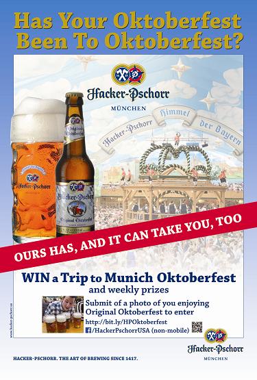 If drinking the original beer of Oktoberfest isn’t enough of a reward in itself, Hacker-Pschorr will also be sending two lucky beer lovers to Oktoberfest 2015 in Munich. To enter, simply post a photo of you and friends enjoying an Original Oktoberfest to the sweepstakes site.