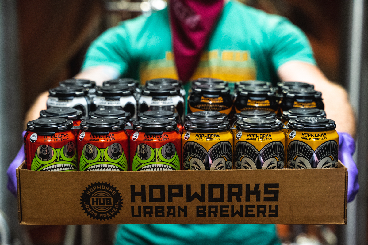PORTLAND, Ore. – Hopworks Urban Brewery has released a variety case of beer called the “Homebound Hero 24 Pack.” The case contains four six-packs of Hopworks’ core beers: the newly released Golden Hammer Organic Lager, Tree Frog Organic Pale Ale, Powell IPA, and Robot Panda Hazy IPA. The case sells for $40 with $5 of each sale donated to the Looptworks Foundation to produce face masks for Central City Concern, a non-profit organization providing housing, health care and employment services for people experiencing homelessness in Portland. Customers can order the “Homebound Hero 24 Pack” at www.hopworksbeer.com for curbside pickup and no-touch delivery until the end of April.