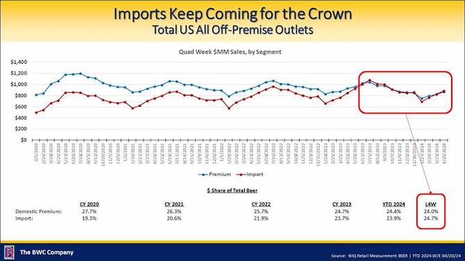 Imports overtook domestic premiums in dollar sales in NIQ-tracked off-premise channels in the four-week period ending April 20, making imports the No. 1 beer segment in scans, Bump Williams Consulting founder and CEO Bump Williams reported in the firm’s latest monthly report.