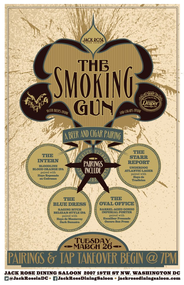 Starting at 10pm, Jack Rose will transform into a beer + cigar lounge, featuring pairings of Flying Dog brews with fine cigars from W. Curtis Draper Tobacconist. Flying Dog will take over two floors of Jack Rose’s new draft lines, with 10 specialty brews including Brewhouse Rarities and limited release beers including the new Bloodline Blood Orange IPA, as well as rare beers from other breweries.