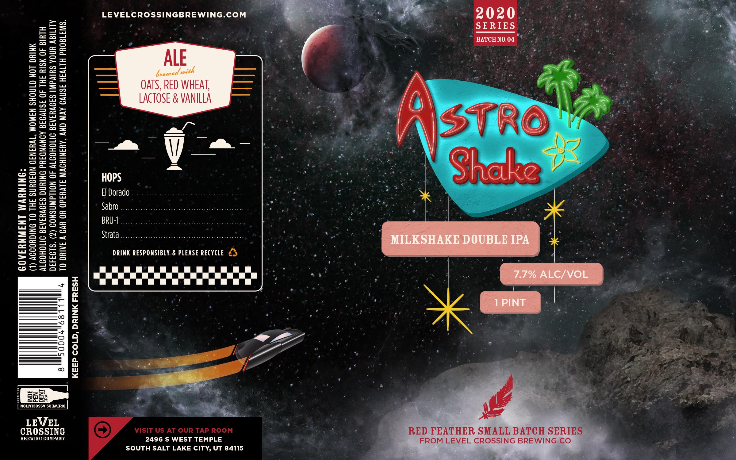SALT LAKE CITY — Award winning Level Crossing Brewing Company is set to release its fourth of six beers in its Red Feather Small Batch Series on Friday October 2, 2020 at 11AM. Astro Shake is a Milkshake Double IPA and measures in at a modest 7.7% ABV. This hypnotizing beer contains Fawcett Pearl malt, Idaho Pure Pilsner malt along with local maltster Solstice flaked oats with red wheat. Balancing out the grain bill, the hops are El Dorado, Sabro Cyro, Strata, and Bru-1. The mouthfeel and flavor profile is complimented by adding lactose and vanilla beans. Astro Shake Milkshake DIPA is nostalgia in a can!