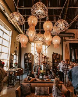 Anchored by a copper horseshoe bar, the tasting room comes embellished with cowhide upholstered seating and leather couches for a relaxed, intimate atmosphere. Wicker lanterns cast a warm glow over the whiskey lounge from an industrial ceiling, featuring functional piping that carries grain from onsite silos into the Rock’s brewery. Adjacent to the active distillery, the room displays enticing scenes of vintage surfboards, a historic direct-fired reflux still deemed Ol’ Woody, and Marshall’s enduring masterpiece, a locked antique Cary Safe.