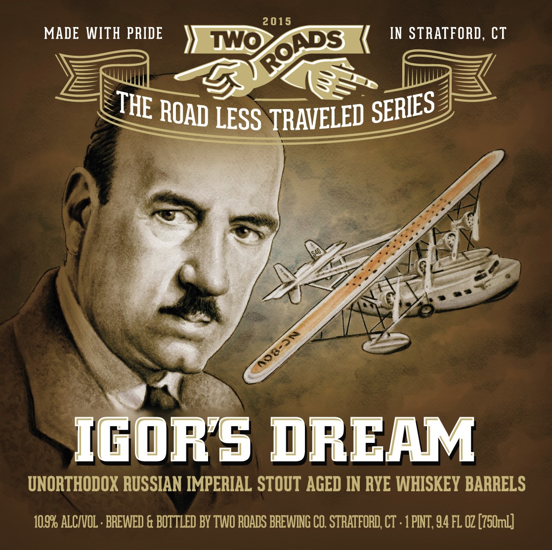When Two Roads opened in 2012, it knew it wanted to honor this visionary man so Two Roads created a very special commemorative beer and named it “Igor’s Dream”—a Russian Imperial Stout which is an appropriate style given his Russian heritage. And like Igor himself, who took the road less traveled when he invented the helicopter, Two Roads took the “Road Less Traveled” when making this beer. The recipe starts as a classic Russian Imperial Stout but veers off the beaten path by using a healthy dose of malted rye and then barrel-aging it in rye whiskey barrels. The beer will be released in 750 ml cork and cage bottles on Igor’s Day, available only at the brewery. 999 bottles will be sold at $20 per bottle.