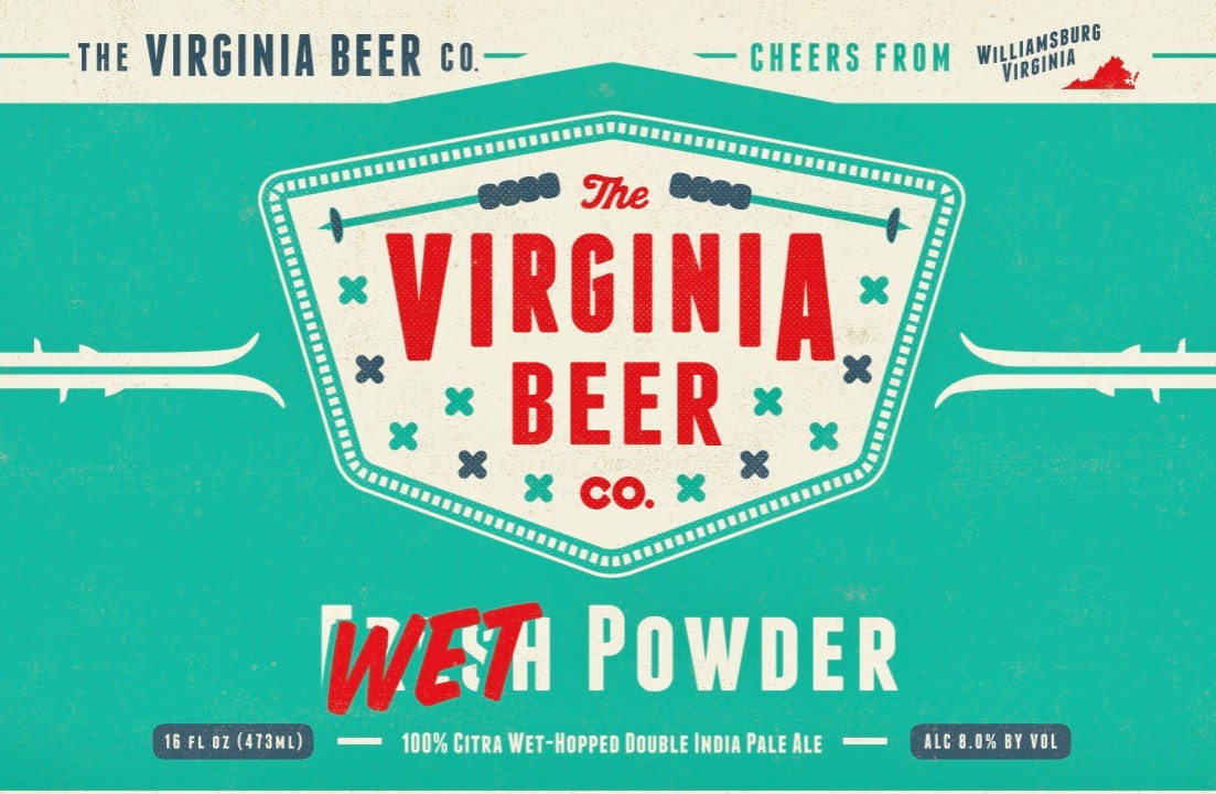 WILLIAMSBURG, Va. — Wet Powder is a wet-hopped version of Fresh Powder 100% Citra Double IPA, brewed during harvest season with whole cone Citra hops that were flown in overnight by the Virginia Beer Co.’s hops providers at Yakima Chief in the Pacific Northwest. These “wet” hops are then used the moment they arrive to create an incredibly fresh-tasting Double IPA bursting with juicy Citra flavor and prominent hop aromas.